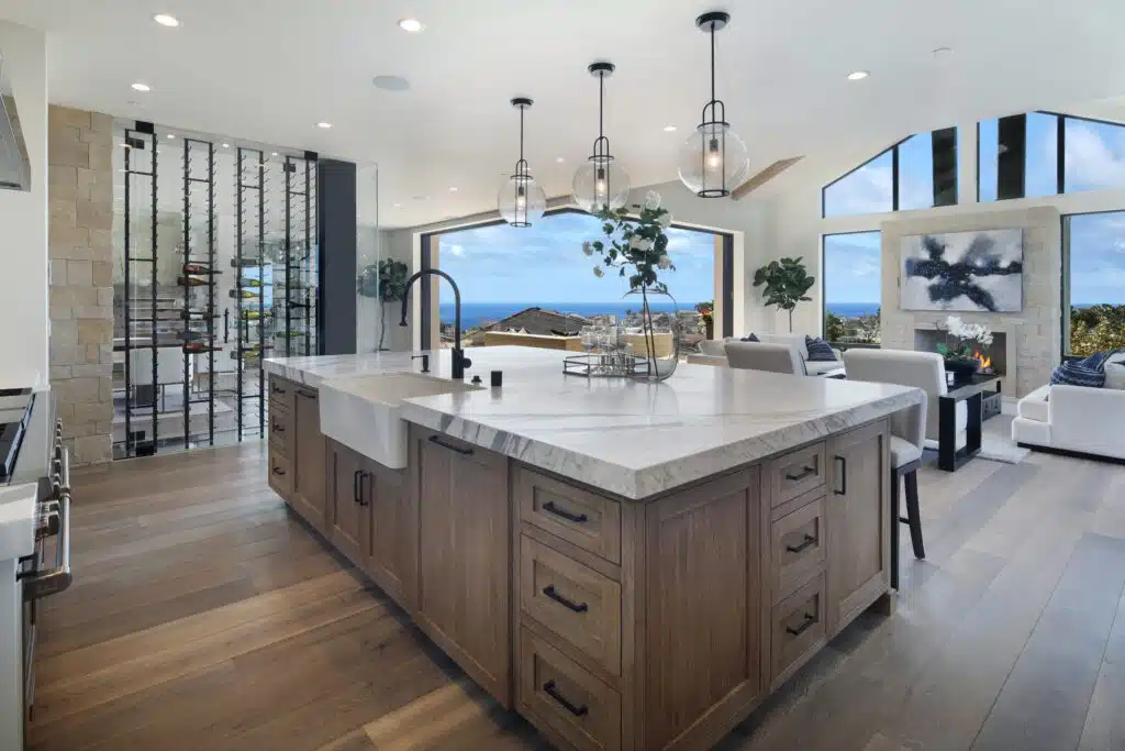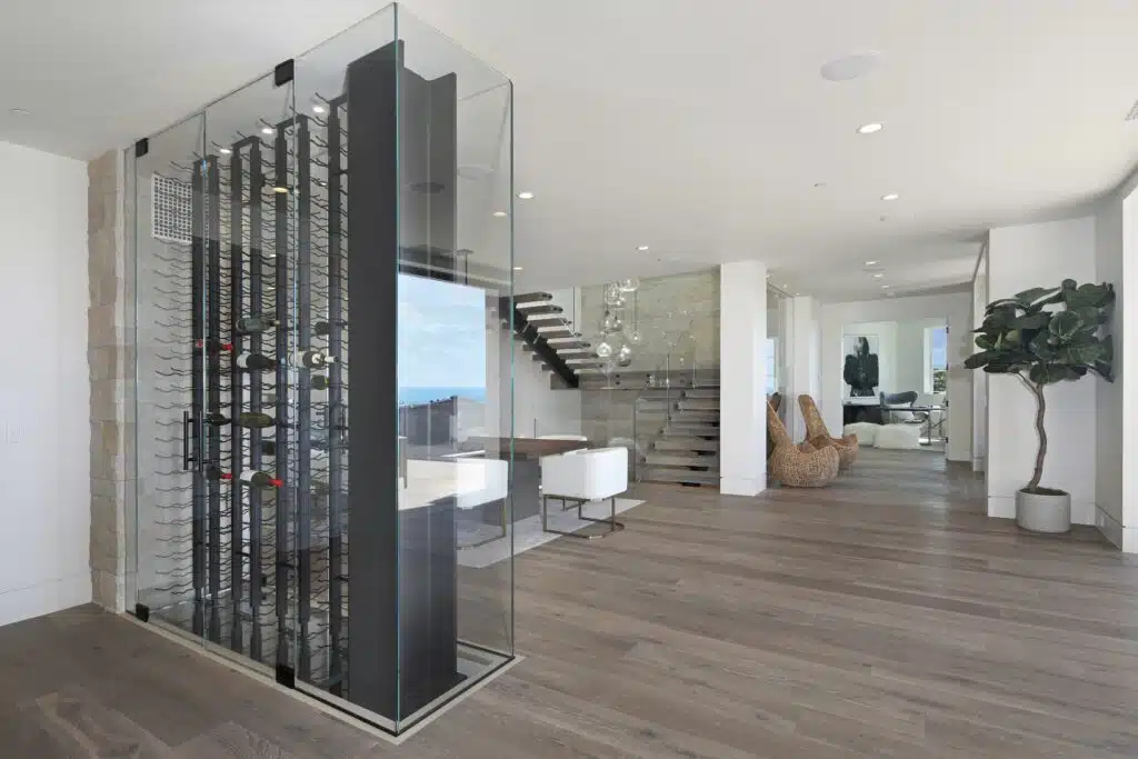 Nestled in Corona Del Mar, CA, the De Sola Terrace redefines contemporary wine rooms. This two-story marvel links the main floor and the downstairs wet bar, offering space for 912 wine bottles. The cellar is fully equipped with 3-sided glass to maintain an ocean view and an airy, label-forward bottle display.