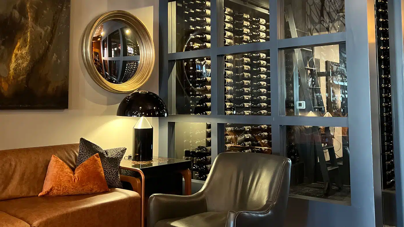 In the wine cellar, Von Saal utilized VintageView’s W Series Wine Rack Frame System to create a subtle, functional display that helps brand continuity. “I wanted the bottles to appear to be floating almost like moths,” he says. “The racks are so minimal. That’s what I really enjoy about the racking systems. They are showing the wines laying on their bellies, floating throughout the room.”