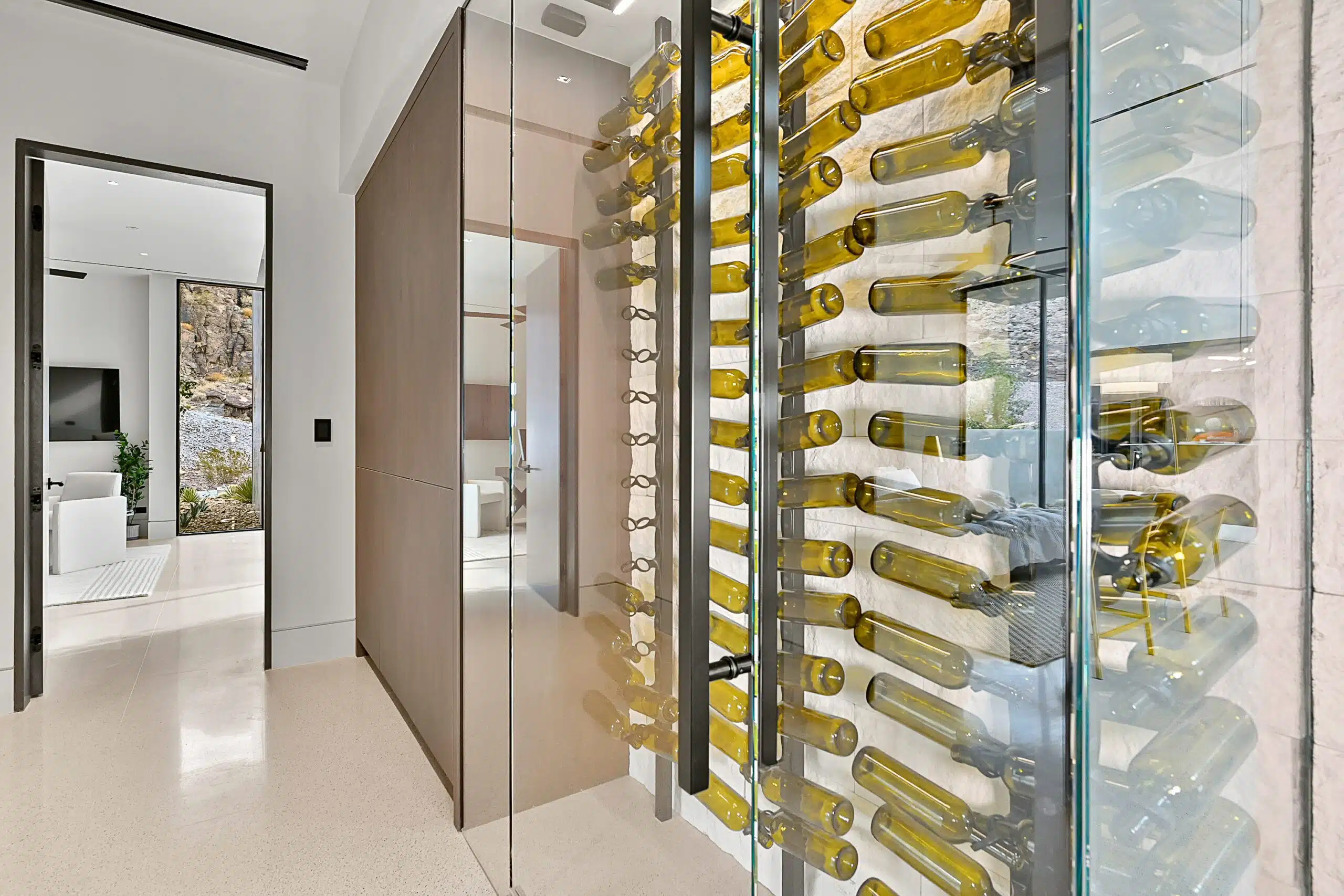 The layout of the grand room allowed for clever design that honored each type of wine storage. The wine fridges were installed in the kitchen and service area, allowing for easy access during parties small and large.