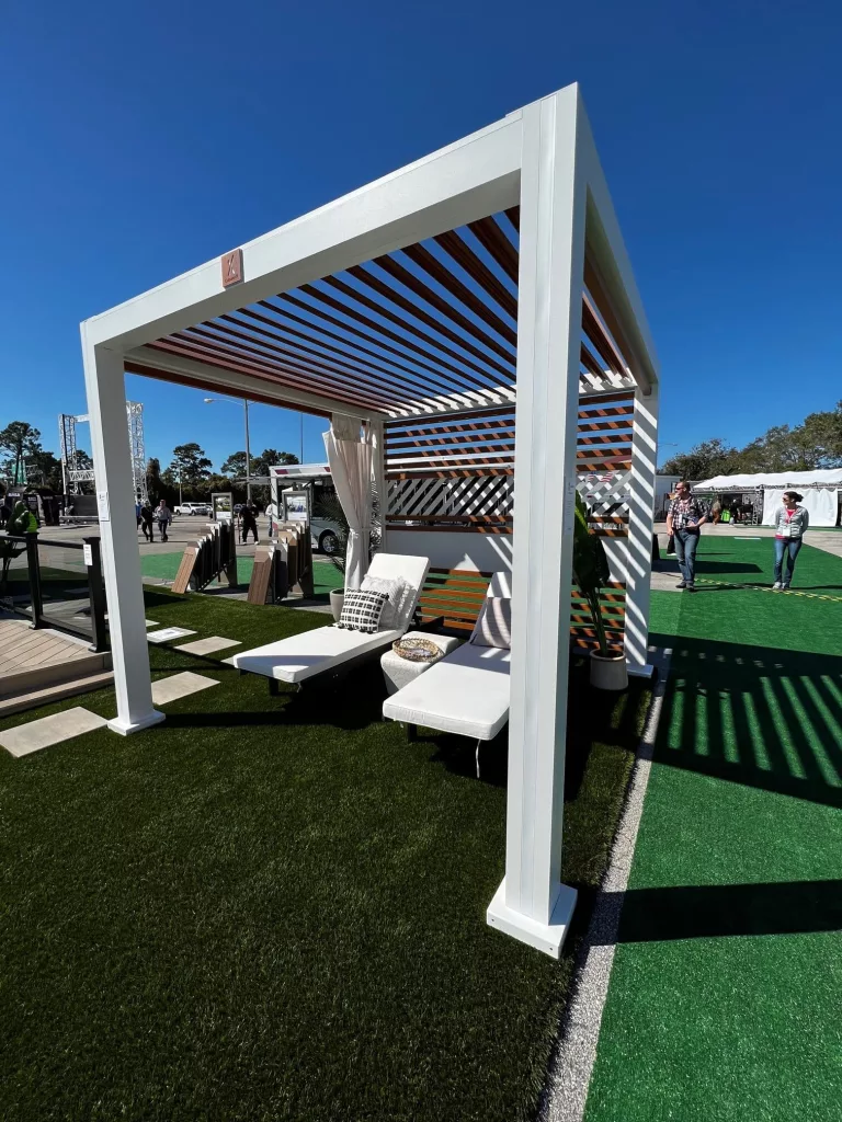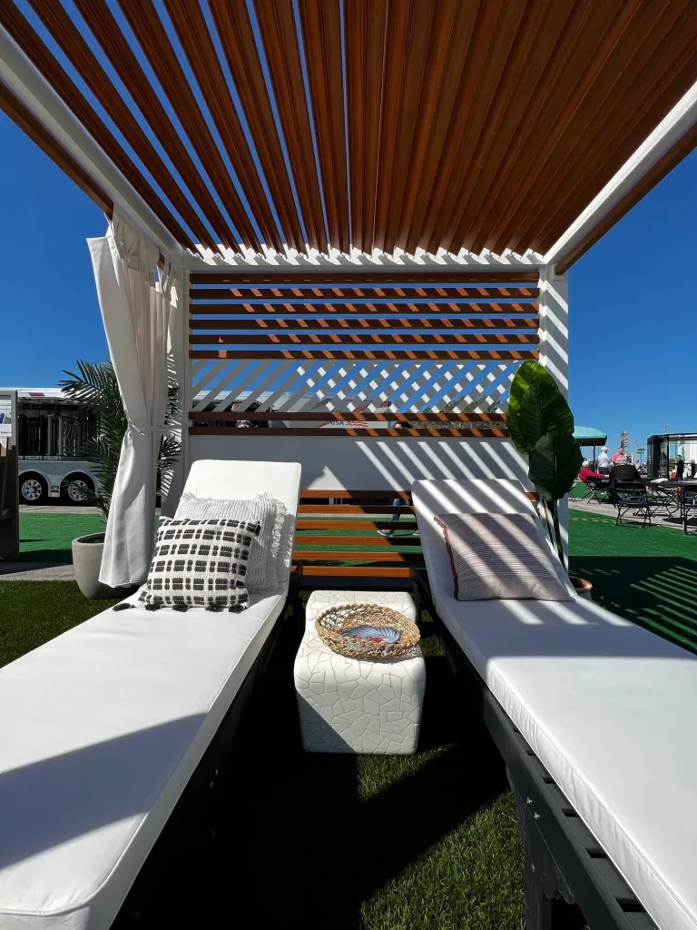 For projects that call for upscale backyard renovation, the Cabana X is the ultimate in outdoor living luxury. The Cabana X is a state-of-the-art system that consists of a 10’ by 10’ frame with pivoting roof louvers, allowing the structure to adjust for maximal shade with a click of a remote. In addition to all of the bells and whistles, the cabana is able to be fully customized with luxury color options and structural add-ons.