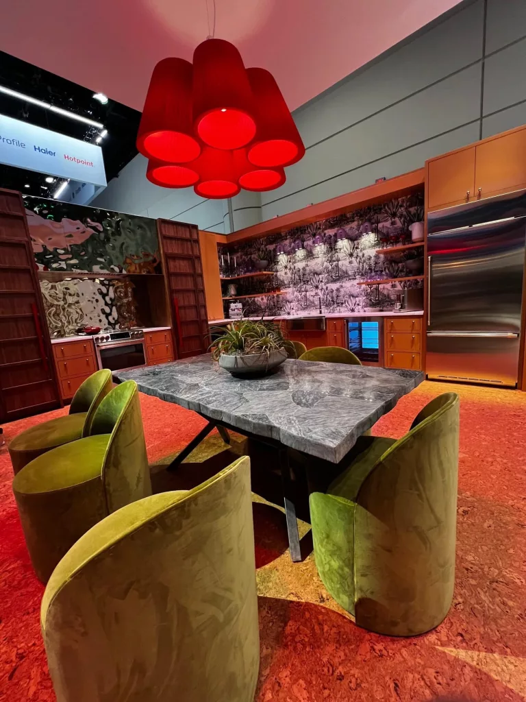 In one staging, you are greeted with a groovy midcentury aesthetic. The walls are adorned with a western-desert motif and the velvet bubble chairs harken back to something the Gibb brothers would have owned. This eccentric space, though bold, came together organically and the Café appliances only amplified the design choices, rather than distract from.